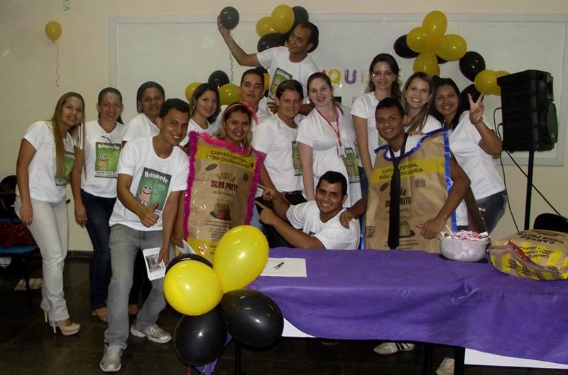 Os alunos do 5º período de Administração mostram o processo de produção do briquete. Feito com sobras de carvão, trigo não consumível e água, o produto apresenta algumas vantagens sobre o carvão comum, como por exemplo a durabilidade, gerando economia para empresários que utilizam o material diariamente.
